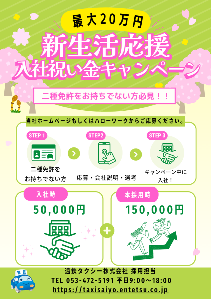 遠鉄タクシーでは、この度『入社祝い金キャンペーン』を開始いたしました!